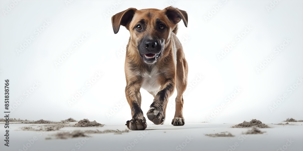 Plakat - Dog with dirty paws leaving tracks on white floor looks guilty. Concept Guilty Dog, Dirty Paw Prints, White Floor, Pet Mishaps, Playful Pets.