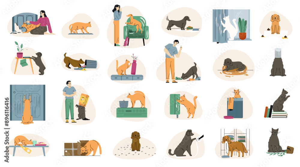 Plakat - Pets bad behavior. Naughty dog and cat behavior, canine problem activities. Doggy chewing, damage home interior and things. Troubles in pet animals life. Flat vector set isolated on white background.