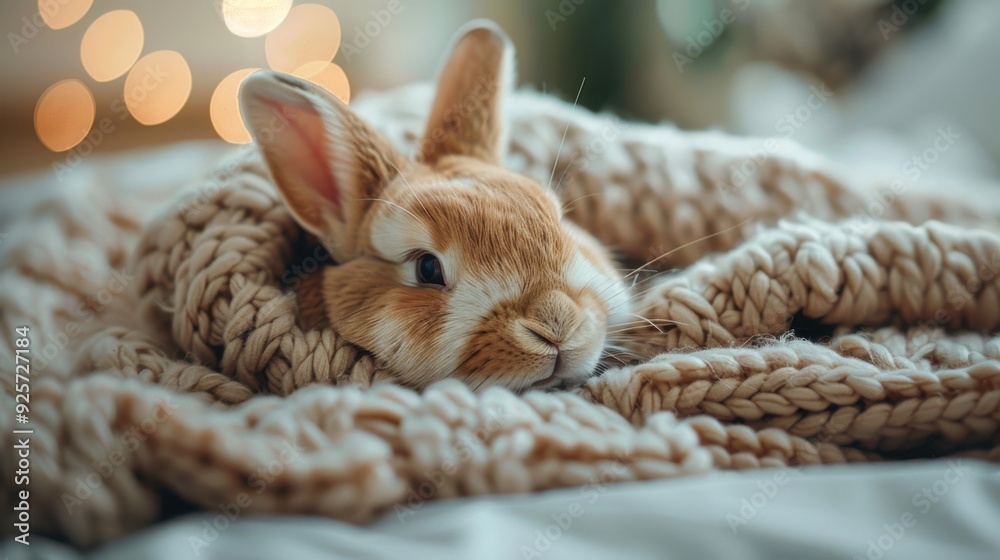 Plakat - A cute brown bunny snuggled in a fluffy blanket with warm, soft lighting..