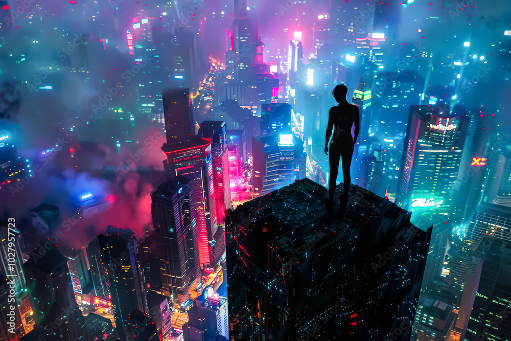 Plakat - Man is standing on a rooftop in a city at night. The city is lit up with neon lights and the sky is cloudy.