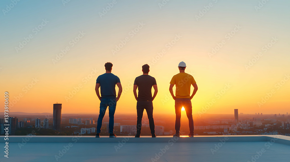 Plakat - Trio on Rooftop: Silhouetted figures admire city skyline at sunset embracing shared vision and future.