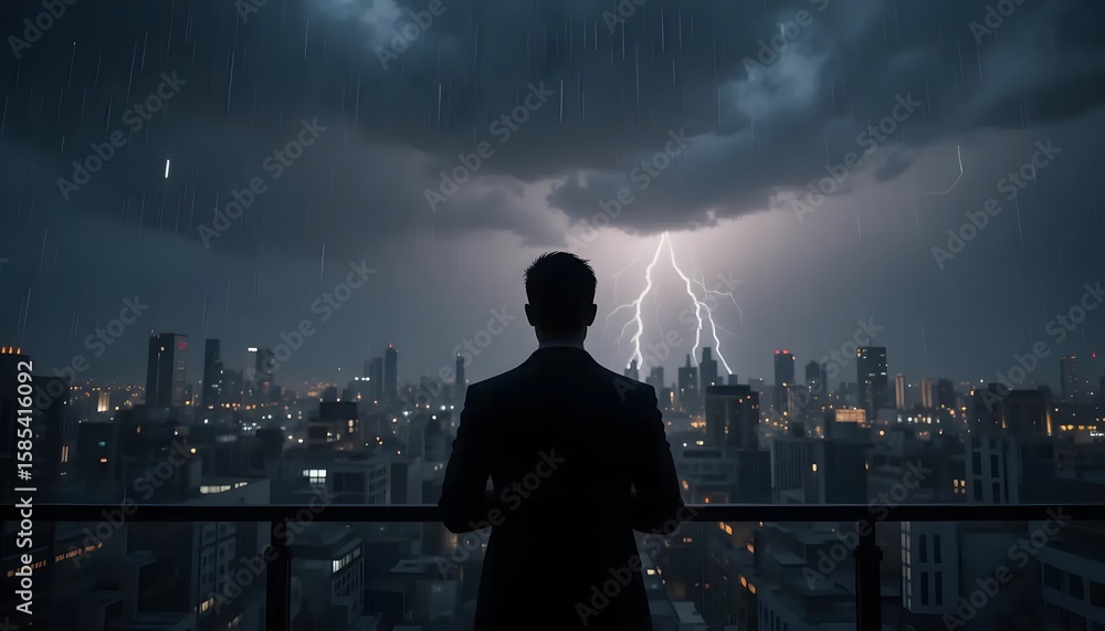 Plakat - Man silhouette watching lightning storm over city skyline rooftop balcony view night.