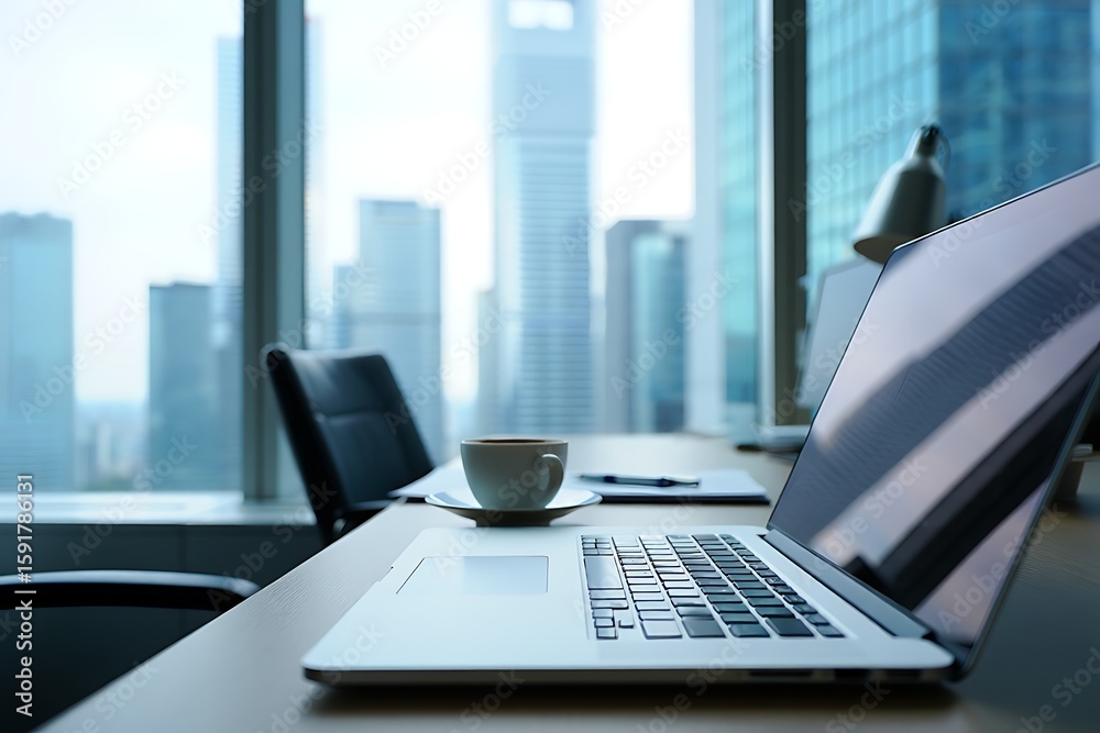 Plakat - Modern office workspace with laptop and coffee cup overlooking city skyline.