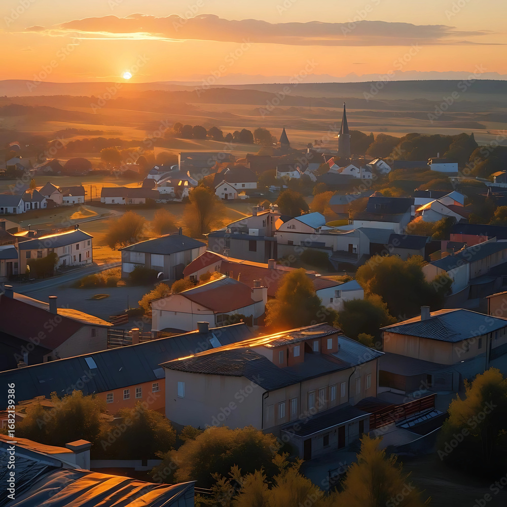 Plakat - Scenic sunset across rooftops with church spire in distance.