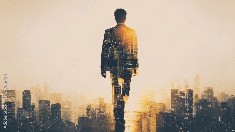 Plakat - back view of young businessman walking on abstract city background success and career concept double exposure no logos no brands ar 169.
