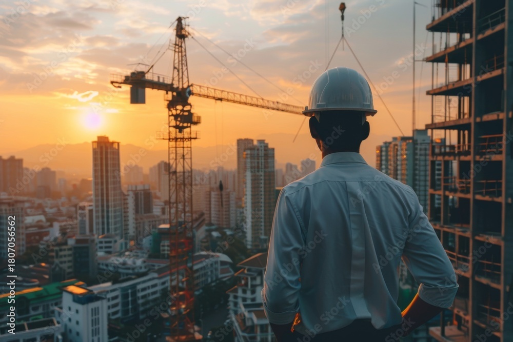 Plakat - Adult man in hard hat observing construction site at sunset.