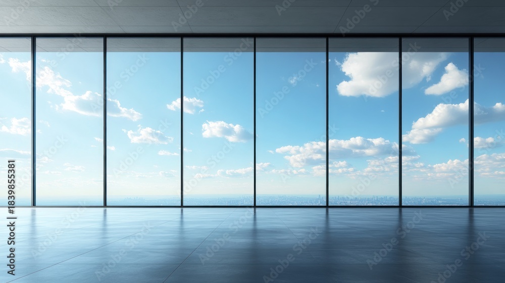Plakat - Modern office panoramic city view, bright sky, spacious room, ideal for business.