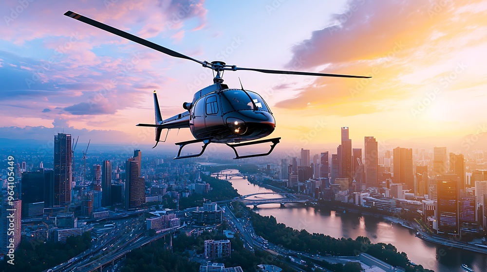 Plakat - A helicopter soaring above a cityscape bathed in the hues of sunset..