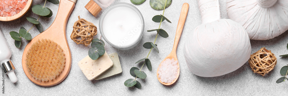 Plakat - Flat lay composition with cosmetic products for spa treatment on white background, banner design.