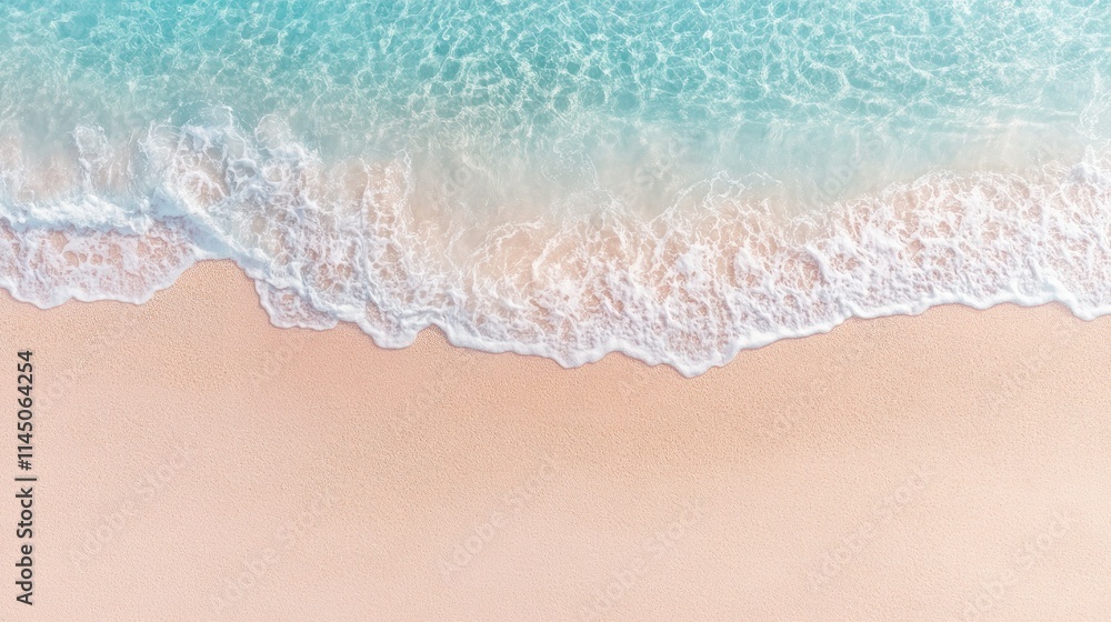 Plakat - Abstract sand beach from above with light blue water wave. Summer vacation background banner with copy space..