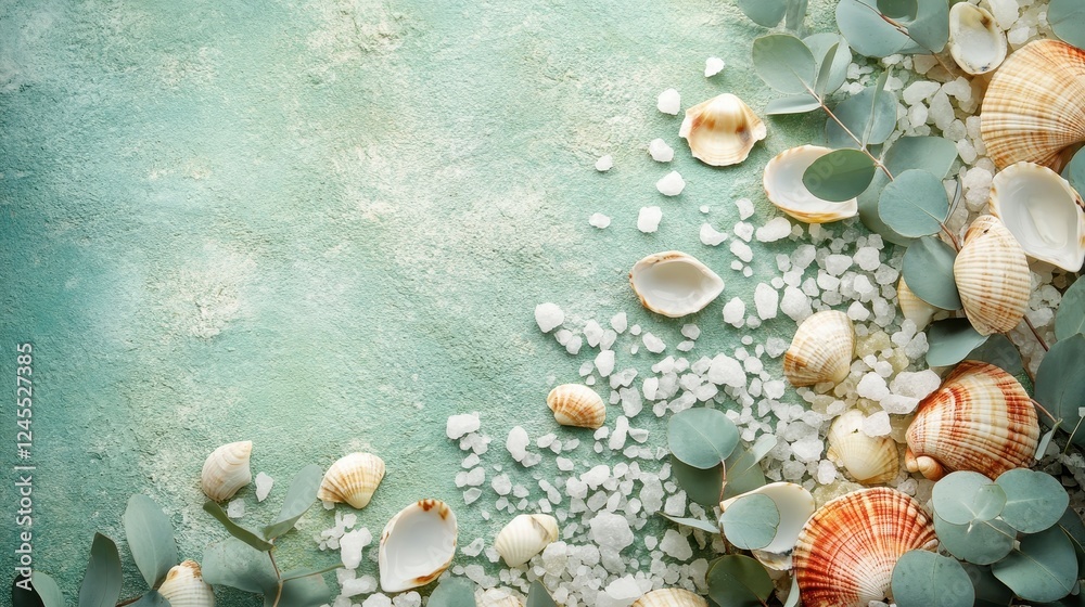 >Plakaty>Sea mineral cosmetic products. Skin care, body treatment products, eucalyptus leaves, sea salt and shells on green background, top view, copy space. Spa and natural skin care concept.