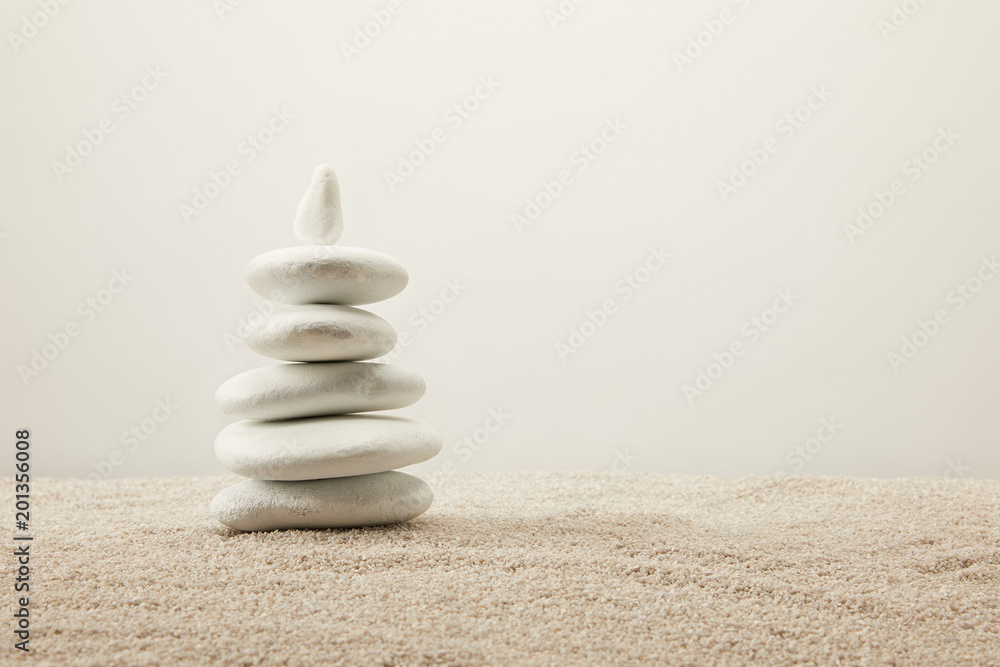 Plakat - close up view of arranged white sea stones on sand on grey background.