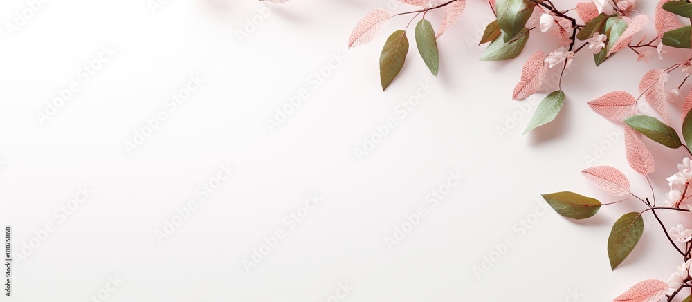 >Plakaty>A minimalistic concept with a nature theme featuring a top down view of pastel background with tree leaves perfectly suited for copy space image