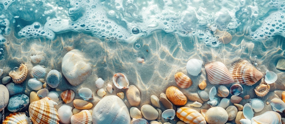 Plakat - Engaging and Natural Title: Top View of Creative Background with Smooth Pebbles, Shells, and Waves Under Transparent Water.