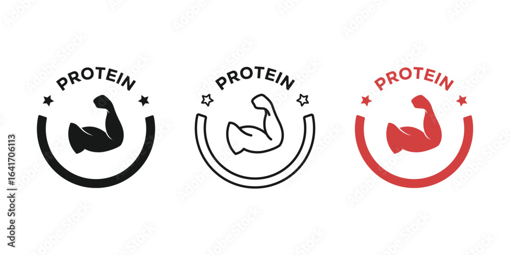 Plakat - High protein icon. Muscle icon set flat style. Bicep muscle icon. Whey protein fitness logo, badge, symbol, stamp. Fitness nutrition for gym and muscles icon. Vector illustration.