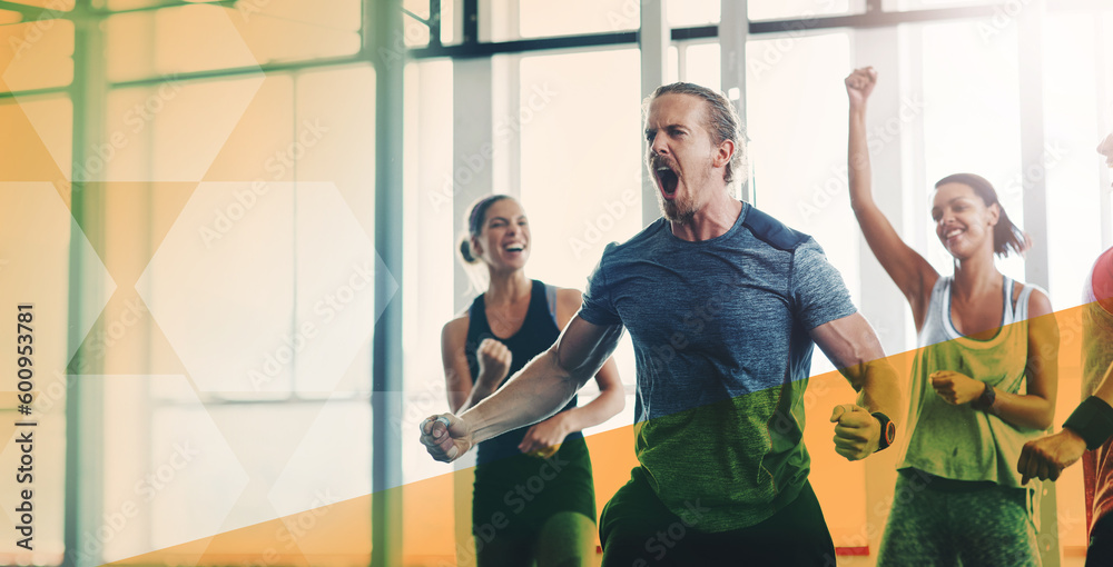 >Plakaty>Fitness, man and celebrate success at gym for exercise, workout and training goals or win. Sports women or group happy about power challenge, strong muscle or achievement support with mockup overlay