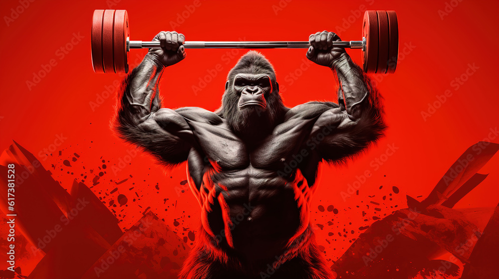 Plakat - Gorilla holds a barbell on a red background. AI generation.