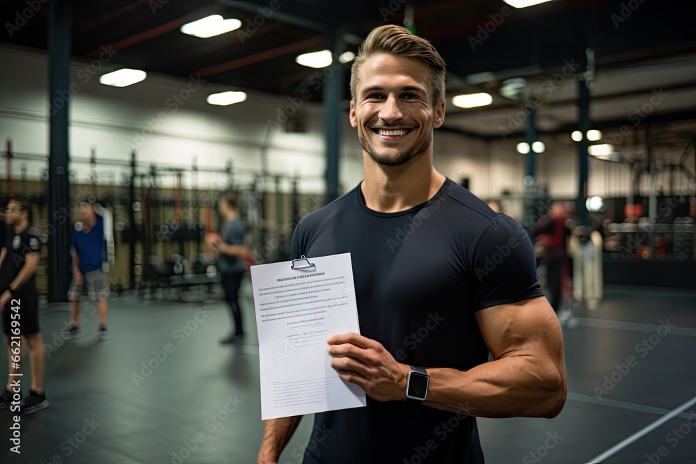 Plakat - Portrait of workout personal trainer standing and looking camera with clipboard in fitness gym background..