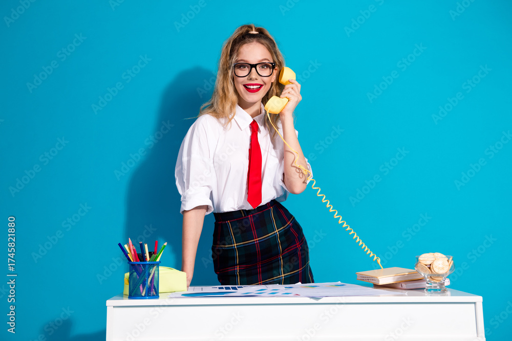Plakat - Youthful student in school attire with bright yellow phone against vivid blue background.