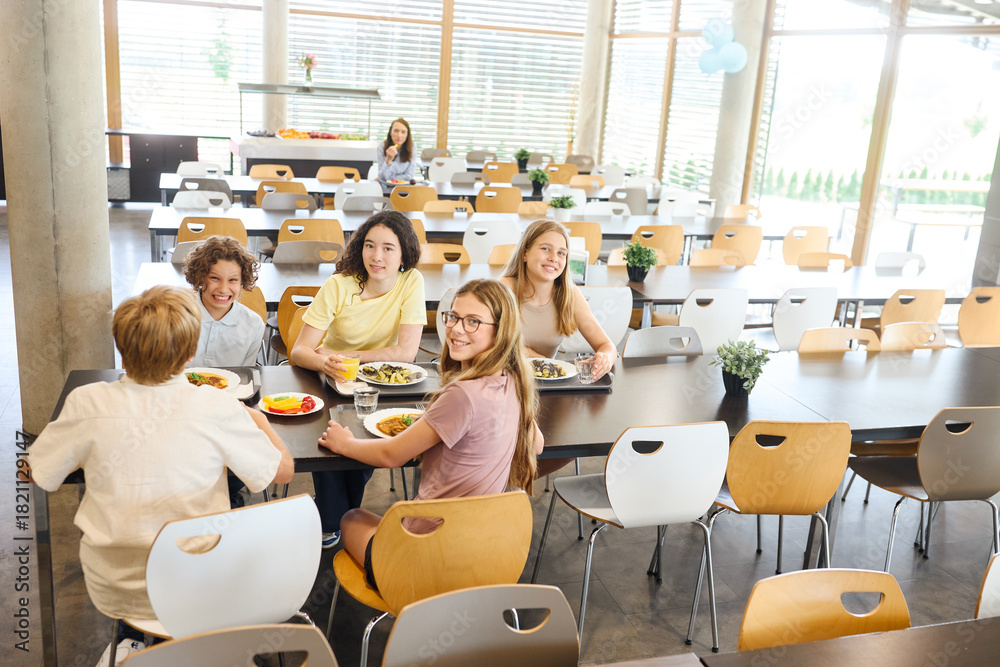 Plakat - Group of students enjoying lunch together in a bright school cafeteria.