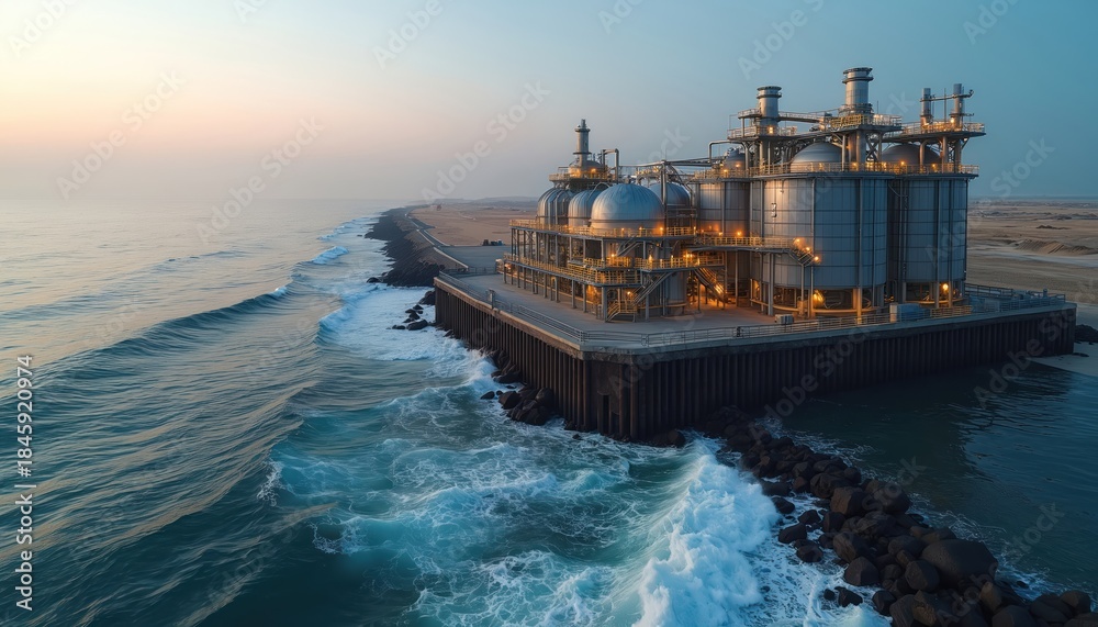 >Plakaty>Wybrane motywy - zobacz więcej !>Architektura>Modern desalination plant on coastal shoreline. Industrial facility uses sea water for fresh supply. Engineering infrastructure operates at ocean edge, processing water.
