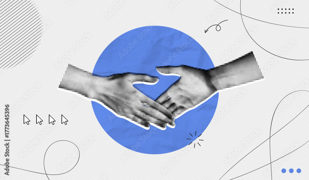 Plakat - Trendy Halftone Collage with Human Hands Shaking. Contemporary art collage. Concept of business, success, teamwork. Deal agreement. Partners work together. Cooperation concept. Paper design elements.