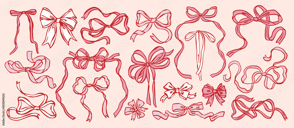 Plakat - Whimsical bow and ribbon illustration collection in hand-drawn ink sketch style. Cute decorative bows and flowing ribbons for romantic, vintage, and aesthetic design projects..