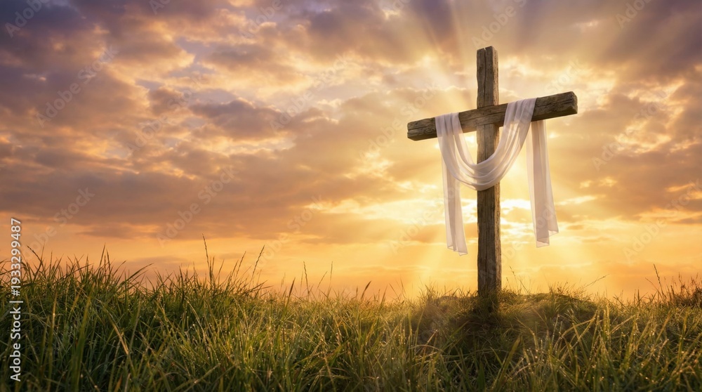 Plakat - Wooden Cross with draped white cloth on grassy hill at sunrise. Religious redemption and hope concept for Easter season..