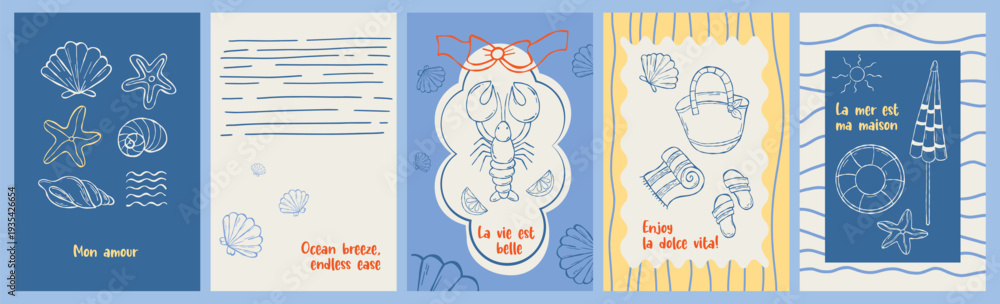 Plakat - Retro summer card Set. Dolce vita aesthetics Hand drawing. Isolated Mediterranean Posters with French and English beach quotes. Vector outline Vintage vertical marine vacation illustration.