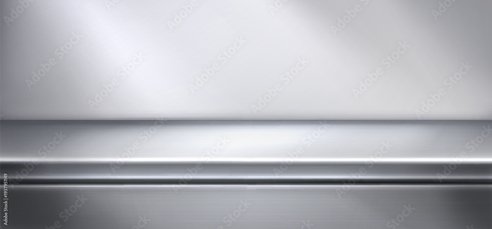 Plakat - Steel kitchen counter with shiny metal surface. Modern 3D realistic vector background for product display. Empty glossy countertop in grey tones with steel texture and clean design..