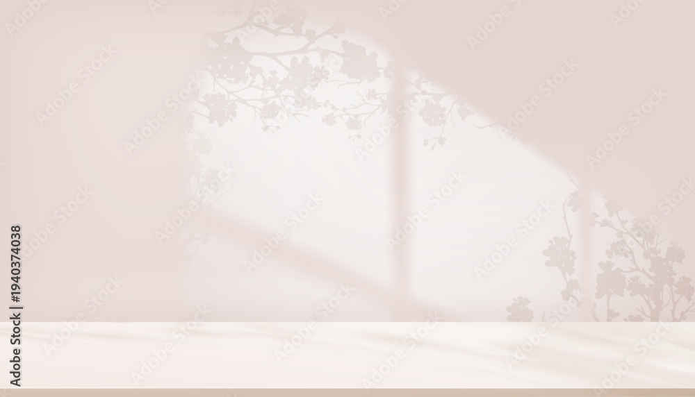 Plakat - Background design pink wall showroom studio with shadow on empty floor for product presentation.Vector minimal soft reflect light,shadow of Spring flower,Summer backdrop design for Cosmetic,Beauty.