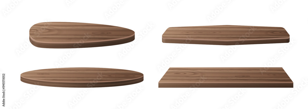 Plakat - Wooden podium with natural wood grain texture, realistic vector illustration isolated on white background. Different shapes platforms, dark brown bases for product display.