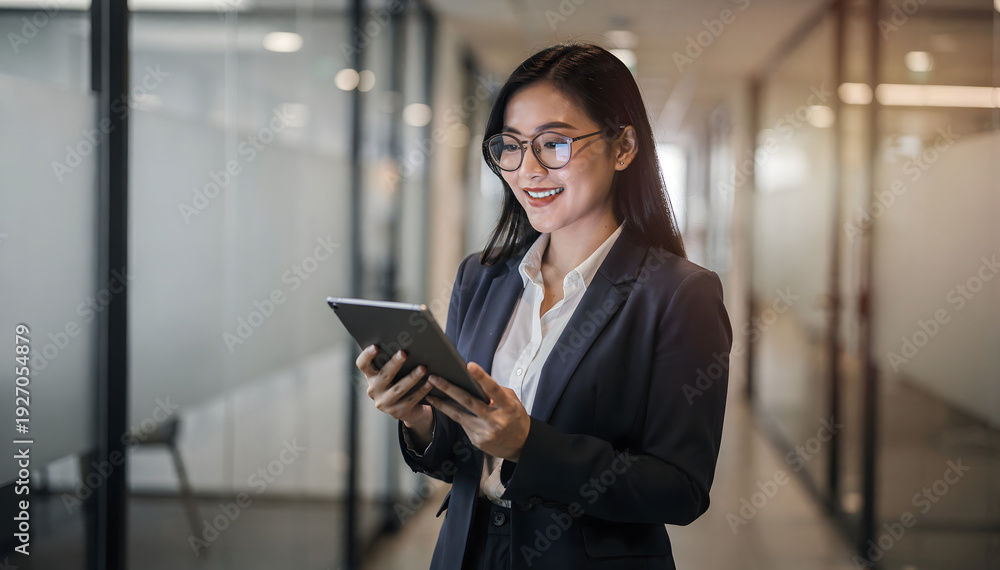 >Plakaty>Wybrane motywy - zobacz więcej !>Góry>Confident young Asian businesswoman in a smart suit and glasses, smiling while using a digital tablet in a modern office corridor, bathed in warm light