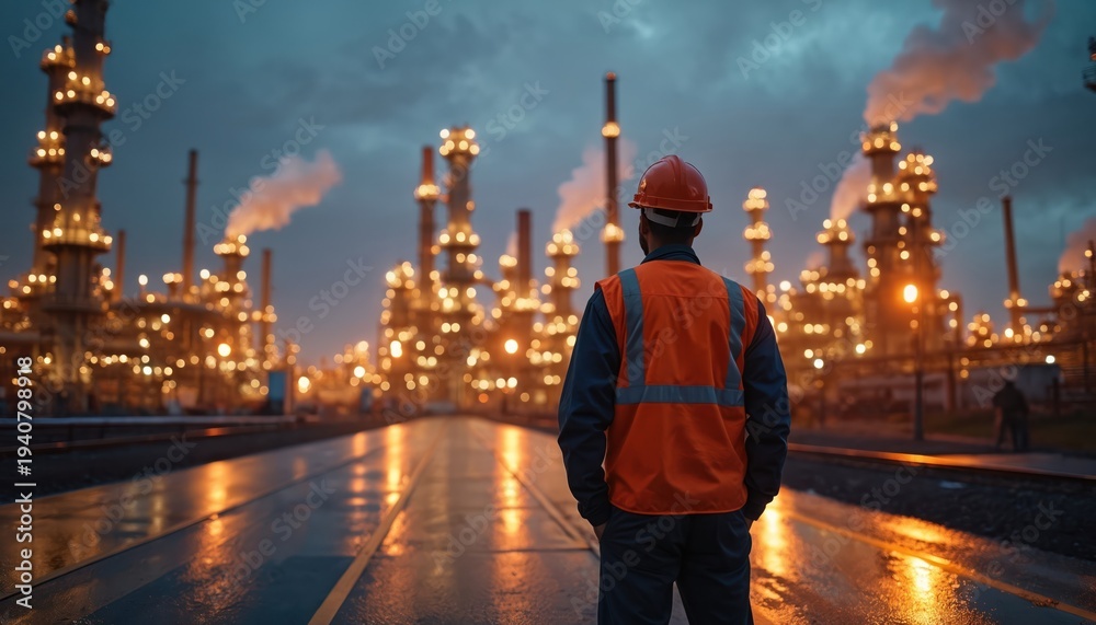 >Plakaty>Wybrane motywy - zobacz więcej !>Góry>Industrial worker in safety vest and hard hat views large illuminated refinery complex at night. Smokestacks emit plumes as steam rises. Workers oversee plant operations.