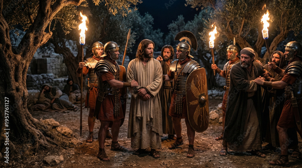 Plakat - Jesus Arrested by Roman Guards in the Garden of Gethsemane at Night.