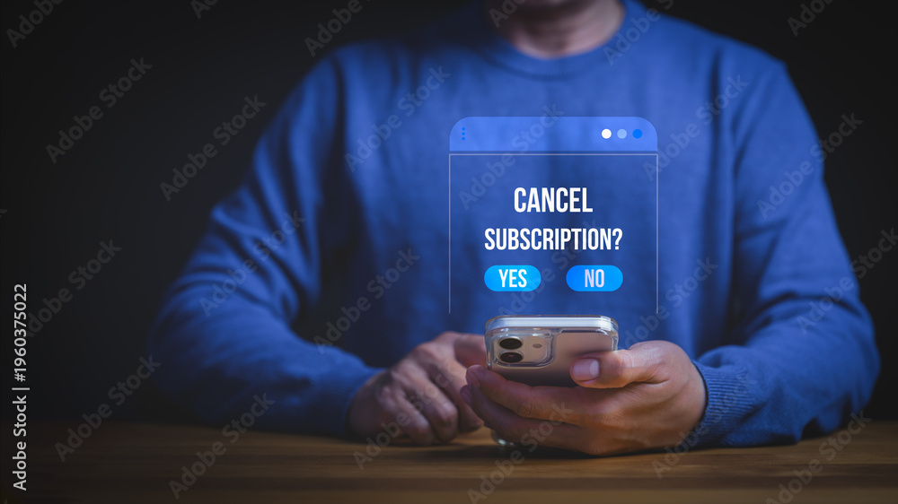 >Plakaty>Wybrane motywy - zobacz więcej !>Góry>Man using smartphone to cancel subscription on digital app interface. Unsubscribe from online service membership or payment plan. Mobile technology concept for business.