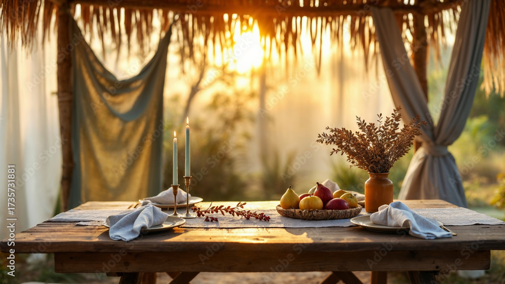 Plakat - Festive table setting in a sukkah during sukkot holiday at sunset, celebrating the harvest season.