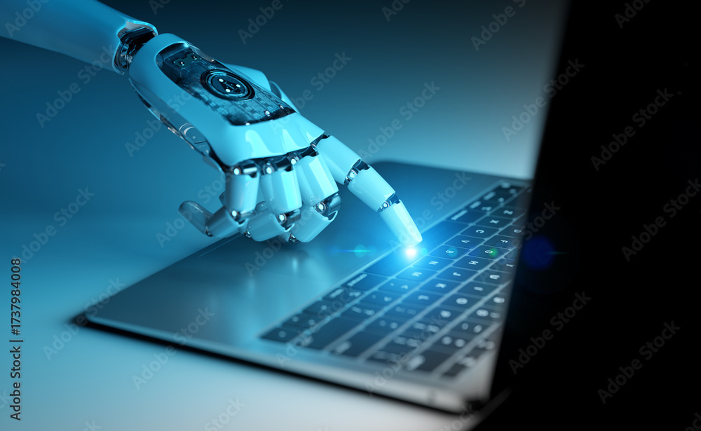 Plakat - Robot using a laptop. Cyborg hand pressing a keyboard with his finger. 3D rendering.