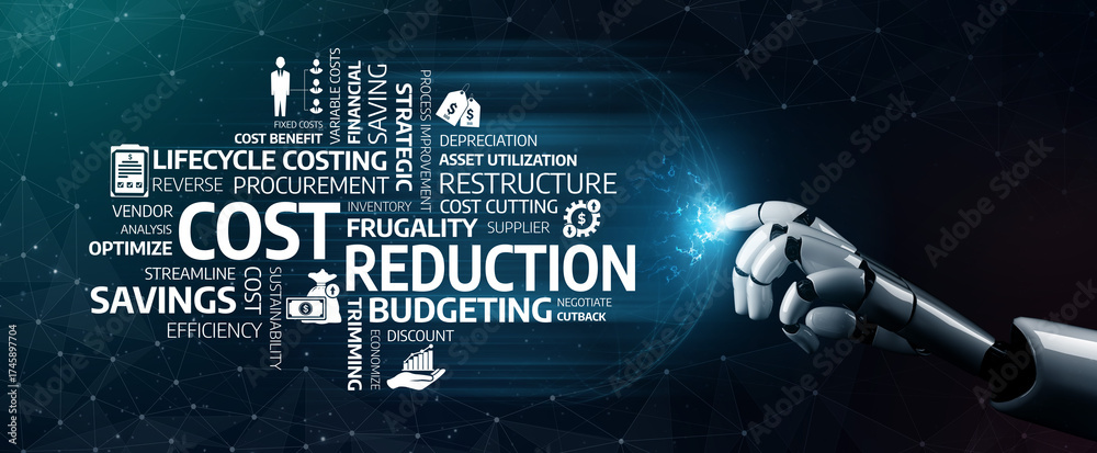 Plakat - A digital illustration showcasing a robotic arm interacting with keywords focused on cost reduction and budgeting, symbolizing modern strategies for financial efficiency. Tessel.