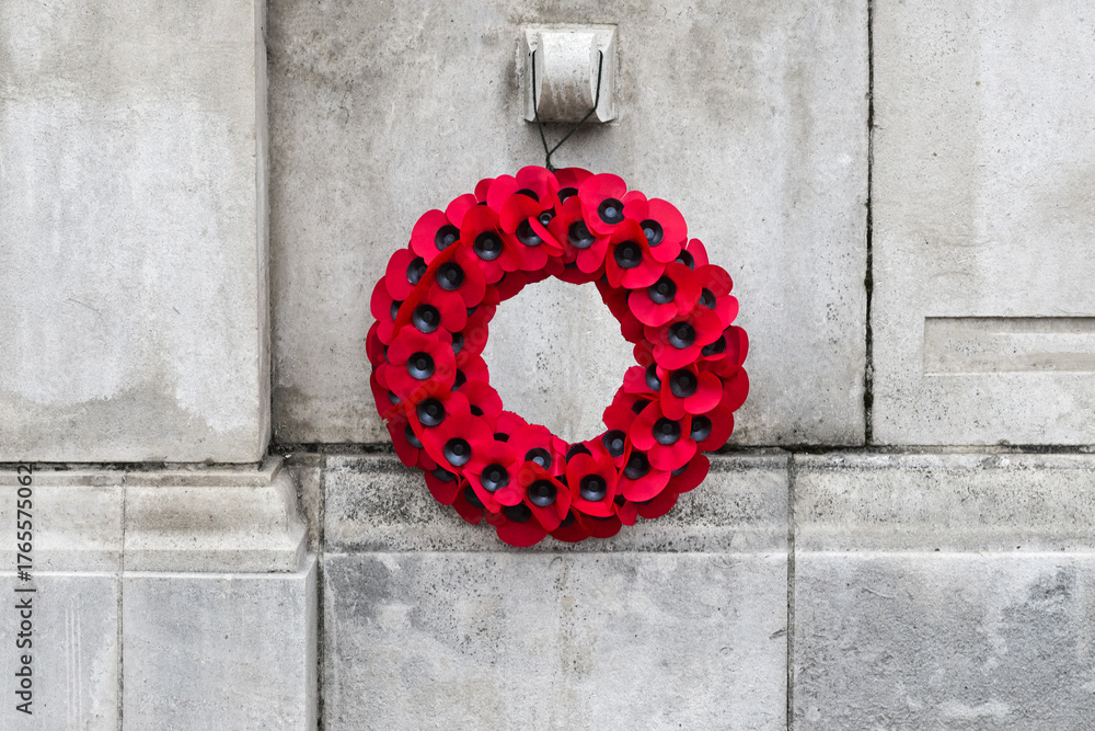 Plakat - Remembrance Day Poppy Wreath Mounted on Wall. World War remembrance day..