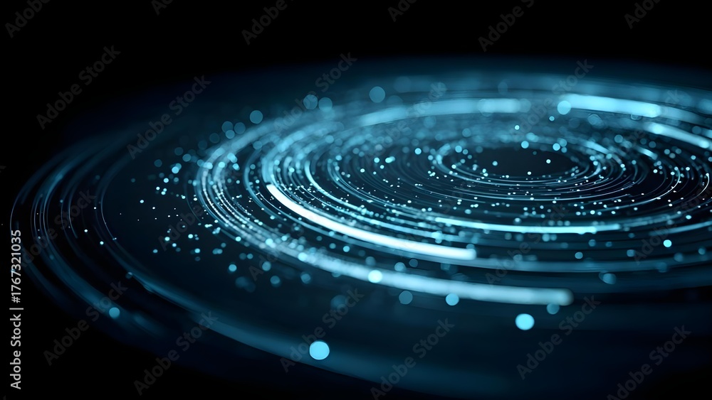 Plakat - Blue glowing concentric rings with scattered light particles swirling in a dark background, like a futuristic data vortex. Concept Blue glowing concentric rings, Data vortex visualization.
