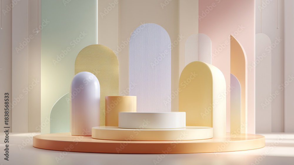 Plakat - Pastel 3D Podium with Abstract Geometric Shapes in Soft Minimal Interior.