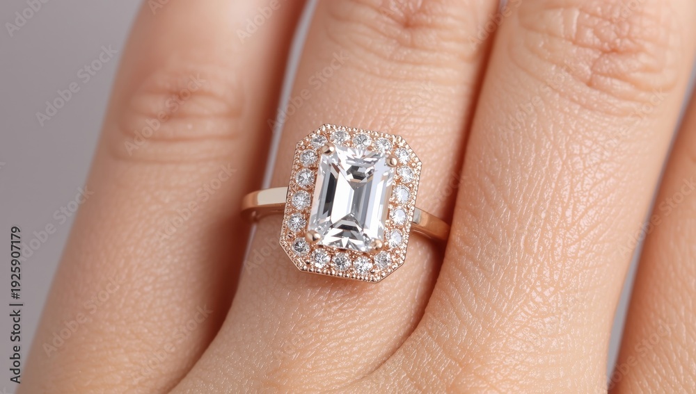 Plakat - Close-up of a luxury engagement ring set featuring a rose gold diamond with an emerald cut and halo.