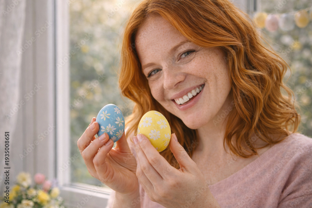 Plakat - Happy red haired woman holding decorated Easter eggs near window, enjoying spring holiday and bright natural light..