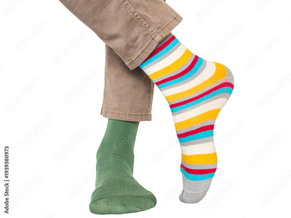>Plakaty>Wybrane motywy - zobacz więcej !>Jachty Żaglówki>Man wearing mismatched colorful striped and green socks and light brown pants without shoes. Casual fashion, individuality and self-expression concept. Studio shot on isolated background, closeup