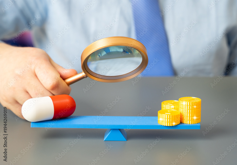 Plakat - Researching the prices of medicines and medical supplies. Monitoring pharmaceutical costs and comparing drug prices. Healthcare affordability, pharmacy analytics and transparency in the medical market.