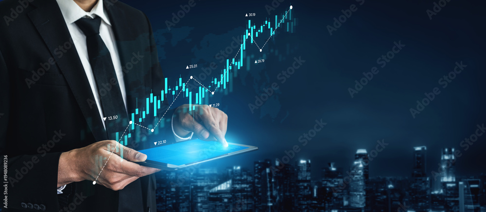 Plakat - Stock market analysis with candlestick chart and price movement trend line, highlighting global financial trends, stock trading, and investment strategy insights Vouch.