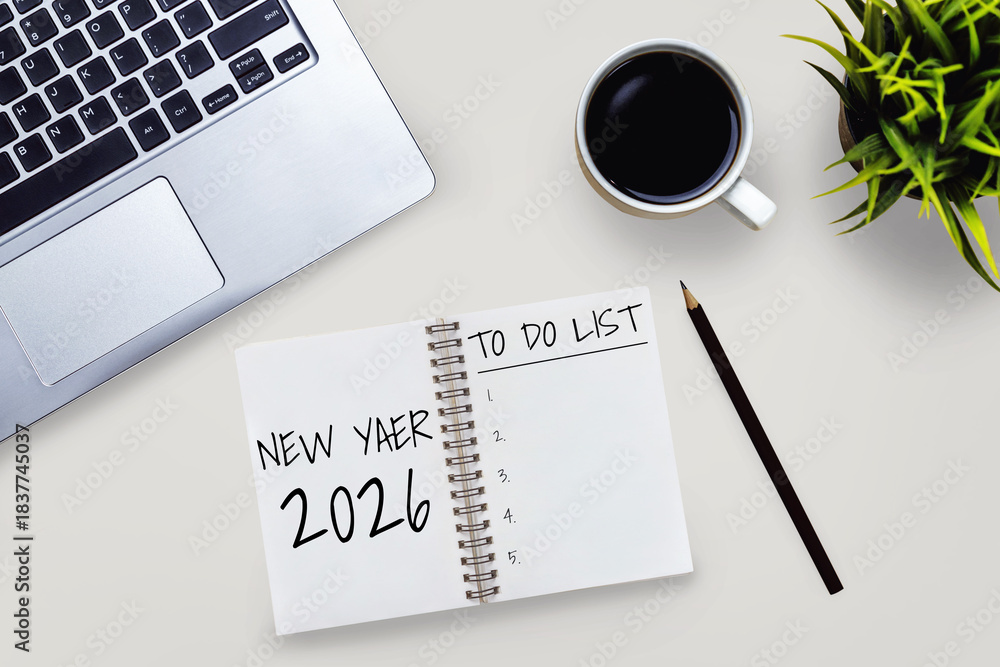 Plakat - 2026 Happy New Year Resolution Goal List and Plans Setting - Business office desk with notebook written about plan listing of new year goals and resolutions setting. Change and glee concept..