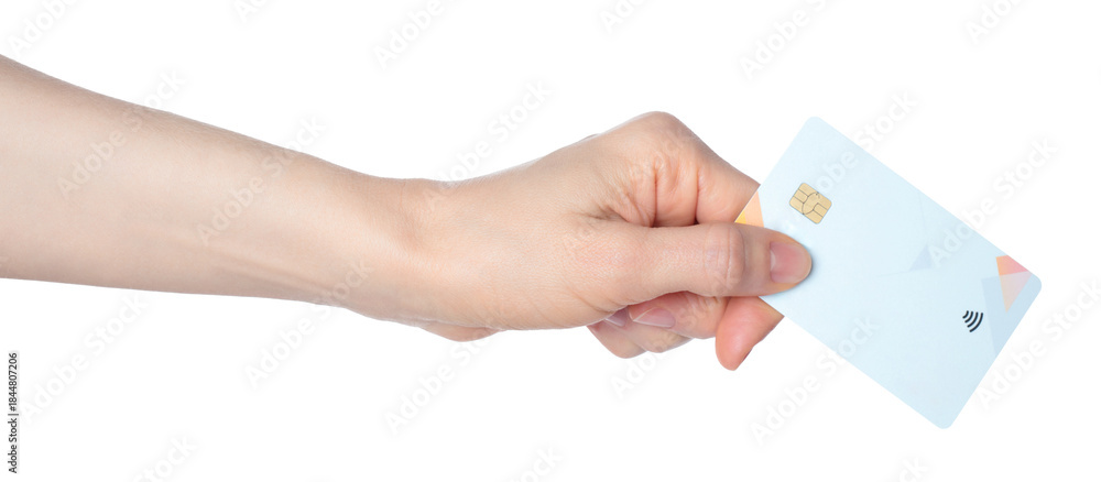 >Plakaty>Wybrane motywy - zobacz więcej !>Kolej>Hand holding a bank card with a chip, isolated on transparent background. Ideal for finance, payment, banking, digital transactions, and security-themed projects