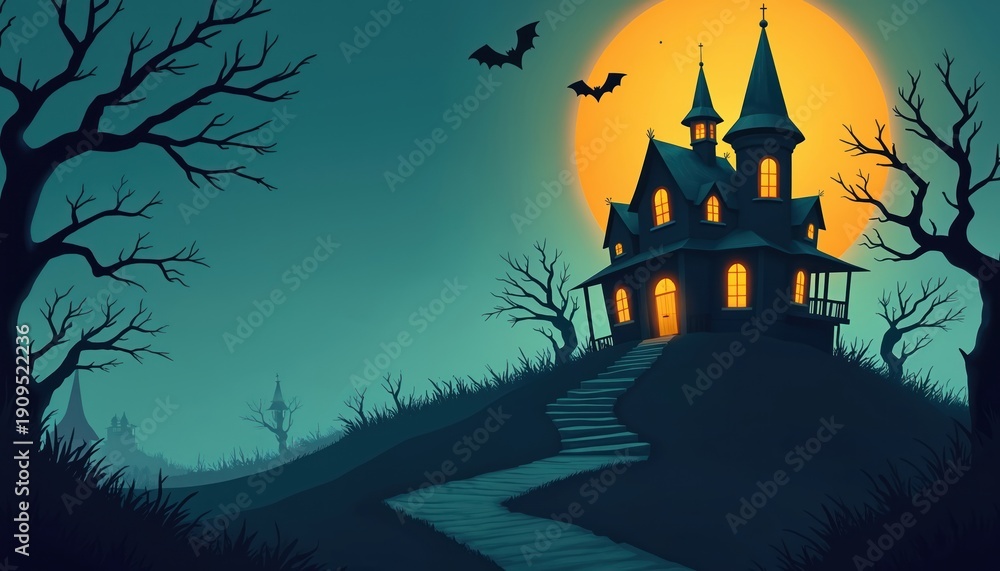 Plakat - Spooky mansion on hill under large orange moon with bats flying near dark bare trees. Pathway leads up to glowing windows of haunted house at twilight..